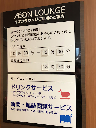 Read moreイオンゴールドカードを所有する人含め4人まで入ることのできるラウンジです。 受付でゴールドカードを提示し、お菓子を1ついただけ、飲み物1杯、30分程度の利用時間となっています。 お菓子も飲み物もプライベートブランドの品ではありますが、イオンを宣伝する目的もあるのでしょうね。 無料でお茶させていただけるのでありがたいです。 ただ、休日は待ちが発生しています。平日は比較的待たずに入るこ...