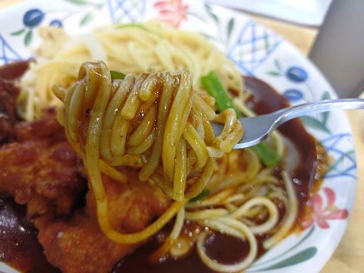 ソースは上にかかってるのではなくパスタ横に。結構胡椒強め、粘度もしっかりぬったり絡んでくれる。一口目から胡椒インパクトがつーん!パンチきいてる。 そしてかなりパスタが特徴的、あんかけスパたる太めコシ、そして油、美味い。 大きめな唐揚げは下味もしっかり、揚げもしっかり、カリッとクリスピーでジュワっとジューシー、トピとしてではなく単品唐揚げで十分美味しい。 メニューとして大盛りが見つけられなかったけど、パスタもソースも大盛りにして頂きたかった...