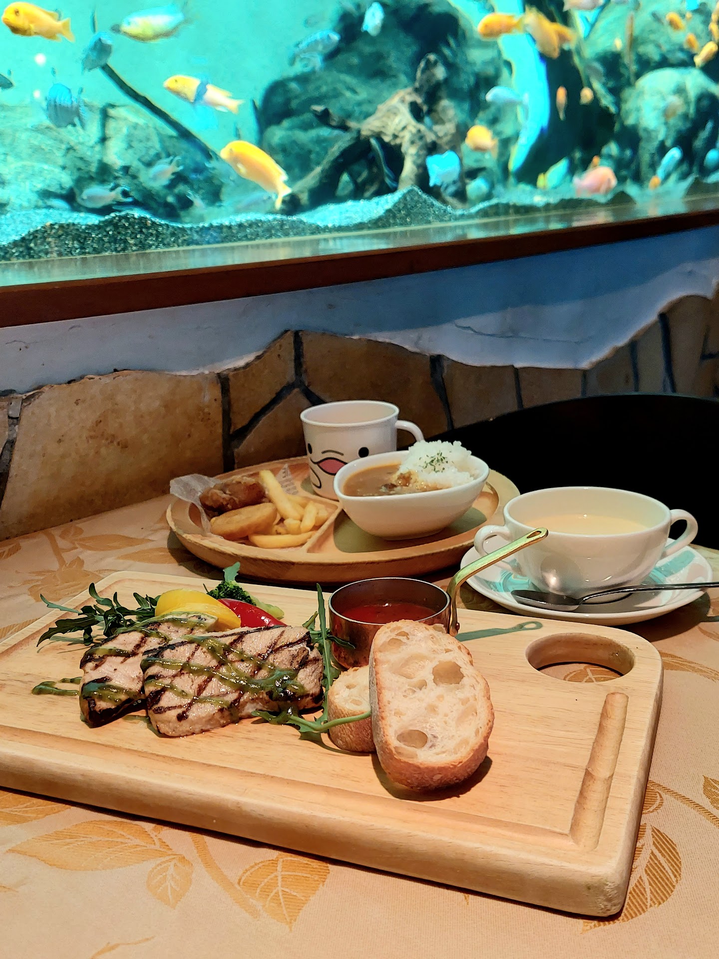 名古屋港水族館でのランチは館内にあるレストラン「アリバダ」さんにしました。 此方のお店は、ガラス越しに港が見渡せ開放感があり、また熱帯魚の入った巨体水槽があるのが見逃せないポイント。 メニューも、「味噌カツ」や「エビフライ」などの名古屋名物が味わえるだけでなく、水族館ならではの珍メニュー「シャークステーキ」や「クロコダイルのコンフィ」などインパクト抜群のメニューもここでしか食べることが出来ない特別感がありますね♪