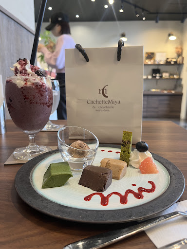 Read moreチョコの魅力がたっぷりのスイーツを頂いて来ました♪ どれを選んだらいいのか.....悩むと言う事で ちょっとイートインでスイーツタイムです♪ . テリーヌの食べ比べ3種セットが有ったので、 そちらと珍しいチョコレートドリンクのメランジュを 楽しんで来ましたよ♪ . 3種食べ比べは、 「おとなのラムビター」「とろける抹茶」「ルビーショコラリンゴ」をチョイス!どれも濃厚でいながら口の中に入れた瞬間 蕩けちゃう♪(こりゃうんまい!) . ラムビターは、アルコールをしっかり飛ばして有り風味だけですが、ビターなカカオの味わいとラムのグッと来る香りが とても鼻抜けが良く、脳を刺激します‼︎‼︎ . 抹茶とルビーショコラリンゴも、同様の口の中で蕩ける美味しさでチョコレートの味わいを残しつつしっかり特徴の有る美味しさに仕上がってました! . そして人気のチョコレートドリンクの ショコラメランジュです♪♪ (ワクワク♪♪♪) スムージー?シェイク? 4月27日(土)から期間限定の販売となります♪ 「ブルーベリーメランジェ」 今が旬のブルーベリーをフローズン! 2種類のチョコレート ブルーベリー好きには堪らない!!! ブルーベリー感あふれる...
