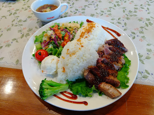 ホットドッグやクレープほかメニューはけっこういろいろありますが、アンガスビーフステーキプレートをチョイス。女子大のお膝元ということで、かわいくオシャレ、かつボリュームもなかなか。お肉だけでなくサラダもたっぷり、オニオンスープもついて880円にごはん大盛100円で、おなかいっぱいです(^-^) 逆に女子大生からすると、ここまで量はいらないのかもしれませんね。店構えがかわいらしい雰囲気なのでおじさんには少し敷居が高く感じますが、駅前ですし、それほど混んでもいないので、学生でなくてもゆったりランチをとりたい時に良いですね。