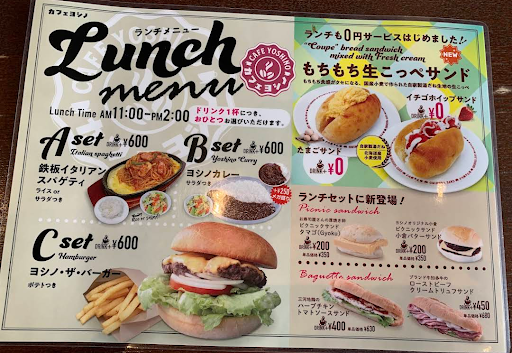 カフェヨシノの醍醐味である1日中ゼロ円でドリンクと何かが付いてくるサービスがありますが、この店舗には無いためそこが残念です。 せめて、ランチにはドリンク➕ゼロ円のサービスをつけて欲しいです。 しかも、同じヨシノカレーが、 他の店舗はドリンク➕600円なのに、 当店はドリンク➕770円ってどーゆことや! 値段が高すぎだと思います。 高いと思われないように単品にすることで誰でも気軽に頼みやすくなると思います。