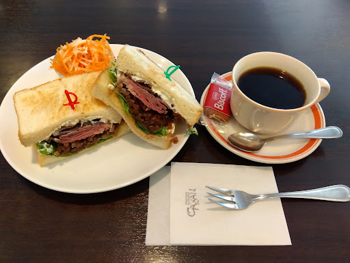 フードは何でも美味しいです。 ローストビーフサンドに入っている飴色玉ねぎがいい。 でもローストビーフやアップルパイなど切りにくい物の時はナイフも添えてほしいな。(ナイフはいただけますが、切れない) ケーキはアップルパイが一番美味しかったです。 温めて出してくださるので、アップルパイの香ばしさと甘さがコーヒーの香ばしさと合って、抜群に美味しい。 スコーンもクオリティが高くて大好き。 スコーンにはクロテッドクリームだと思うので、、+100円くらいしてもいいから、クロテッドクリームを付けれるようにして欲しいです。