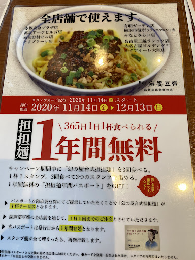 3時過ぎのアイドルタイムかと思えばランチメニューが注文できたのでランチ(麻婆豆腐とエビチリランチ)二つに生ビールと、3杯食べれば1年間毎日1杯タダになる坦々麺を食べるか悩んでたら近くの席の人が3杯頼んでたけど茶碗サイズだったのでとりあえず1つ注文したら余裕で食べれたので追加で2つ頼んでパスポート楽々ゲット。(でも1杯450円は高い感じ、180円くらいの坦々麺かな)