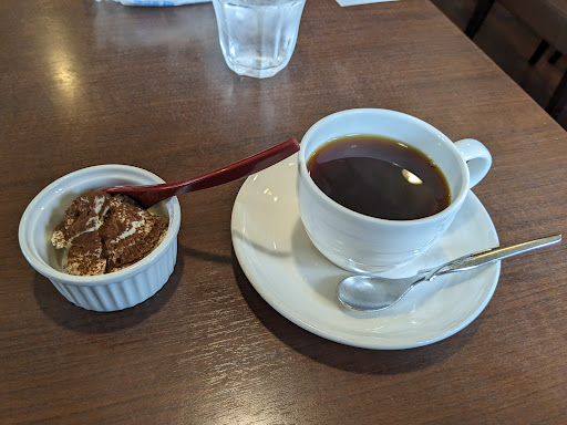 年明けまたまた再訪☕今日は朝からスイーツということで自家製ミニケーキが付くモーニングのCセットをオーダー🙋 何が出るかな何が出るかなとワクワクしていたら今日はティラミスでした😁ミニケーキとは謳っているケド💦けどけど💦💦ホントにちっちゃいな💦💦💦濃厚で美味しかったケド💦こりゃトーストのモーニングに比べるとハズレ感強いわ�...