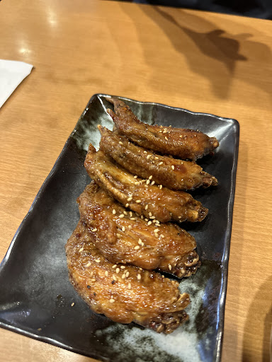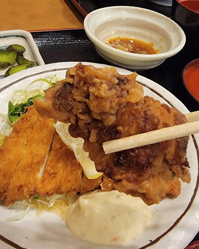 三河地鶏定食と手羽先タレ味を注文しました。 地鶏はカツ1枚と唐揚げ1個でした。タルタルソースとしょうゆの大根おろしをつけていただきました。どちらにつけても美味しかったです。 手羽先は、タレ味ですがコショウがとても効いていてスパイシーでした!皮がパリパリで美味しかったです。