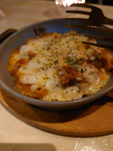 ラザニア風デミネーゼは、タリアテッレのような平打ち麺にラザニアが乗っているような感じ。 ボロネーゼみたいな感じでおいしい。