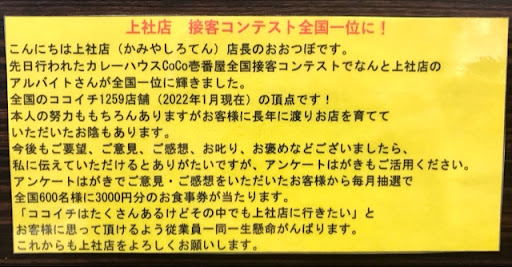 ただ、この店は完璧の一言。接客がココイチに限らず、これまで利用したどの個人店・チェーン飲食店よりも素晴らしい。感じ良く丁寧で気配りまでしてくれる。料理についても、どの時間帯に利用しても安定した品質で提供してくれる。