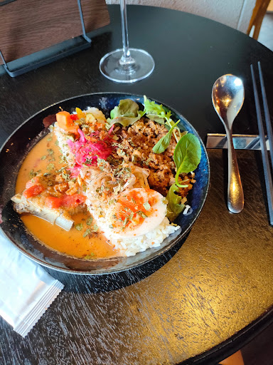 店舗専用の駐車場はなく、店内はテーブル席が並ぶ造り。 カウンター正面に並べられた数々の銘酒、お酒が私を呼んでいる気がした。 終始客は私のみだったが、久し振りに頂くスパイスカレーをしっかり味わえる環境。 約1年半振りにやってきたが、今回は残念ながらお一人で昼飲み目的ではない。 此方のカレーは常時3種があり、2種でも3種でもあいがけが可能。 定番のキーマカレーと日替わりのポークビンダルー、この2種あいがけを頂く。 前回も感じたが、盛り付けのセンスが素晴らしい。 頂く前から香りも感じるが、これ目の前に出されたら一気に食欲が沸いてくる。 ピリッとスパイシーなキーマ、ゴロゴロ粗挽きミンチがめっちゃ好き。 ポークビンダルーは豆と大きなスペアリブのコンビ、このスペアリブがホロホロに煮込まれている。 思わず骨を持ってしゃぶりついてしまう美味しさがあり、ギネスビールがあればなお良かったと思ってしまった。 珍しく体調不良が続き食欲が落ちていたが、元気になるスパイスカレーだった。 次はまた昼飲みで訪れたいな...