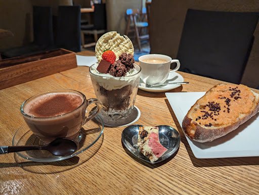 追記…… 1ヶ月後、夕方ごろに再来店し、前回と同じパフェを頼んだのですが…味が全然違っていました。 三枚目のアップの写真が再来店のときの写真です。 中に入っている生チョコが以前と違うフレーバーで、最初に来たときはノーマルの生チョコでしたが今回は香り付けがあるように思いました。また、入っている量が明らかに減っていました。 上に乗っているクランチチョコの数も減っており、中に入っていたケーキが冷凍状態?で固くて味がしませんでした。 そして、中に入っているはずのチョコレートのジェラートを入れ忘れられてました。こちらは店員さんにお伝えして別添えで提供いただきました。 最初の来店時にはとても美味しかったので、来る日や時間によって提供メニューにクオリティの...