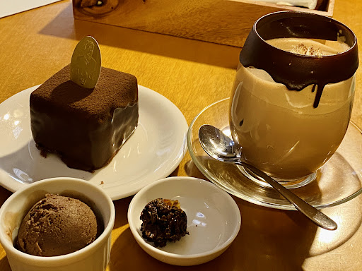 ‘22/3月 ひとこと、『優雅✨』。 PayPay使えます ◆チョコラータ¥450+税 ◆ショコラフロワ(ドリンクセット)¥580+税 ショコラフロワはアイスチョコレートドリンク🍫アイスグラスに飾りつけられたチョコレートが魅了します✨華やかなチョコレートの濃いドリンクです。 人気No.1メニューのチョコラータはココアパウダーたっぷりかかったチョコケーキ🍰 なめらかな濃厚なチョコレートに包まれたケーキは口にいれると思わず目をつむってしまうおいしさ🥺ひとくちひとくち「ホワッ☺️」ってなりながらうっとりです😍 ケーキにはセットでジェラートが付き、ドリンクにはセットでお菓子が付いていました。こちらもチョコレートだらけなのでやっぱりチョコづくしになってしまいました😆 ジェラートやお菓子にしてもチョコレートがおいしい😋最...