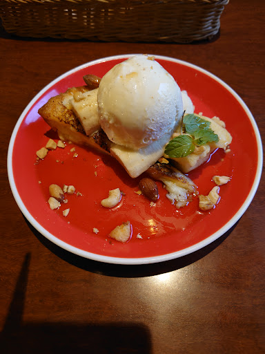 Read moreスイーツと紅茶いただきました。 名前が別名でありましたがフレンチトーストみたいなのです。 甘くて美味しかったです。 ちょっとしたおやつに良さそう バニラアイスとバナナとナッツ類がフレンチトーストにのってました バニラアイスが特に美味しくて。 バニラの匂いと風味が良かった☘️こうゆうフレンチトーストにのってるバニラアイスあっさりめが多かったから嬉しいです