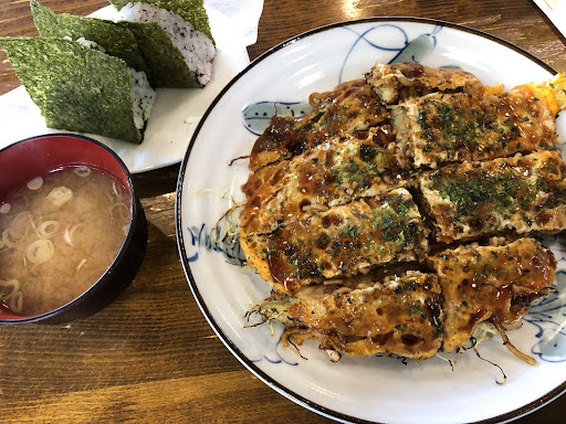 ・味噌汁は意外?にも繊細な味で五臓六腑に染み渡る絶品! ・お好み焼きは、このセットでは小さ目に作ってる様です。そこそこの大きさもありますが、これがまた野菜たっぷり、そばも少し太めですが、これがまたペロッとイケました‼️✨是非広島の様に単品で麺ダブルとか食べてみたいっ✨ ・オニギリはゆかりのおにぎりです。よく見ると、一般的な海苔と違いどちらかとゆうとあおさ系で鮮やかな海苔を使用されてパリパリでこれまた絶品っ‼️✨