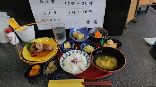 玄庵でランチ。おまかせ定食は、11:30~からで、ご飯、お味噌汁、お惣菜の小鉢を数種類にメインが有り、今日は、赤魚の煮付けでしたよ。小鉢は沢山有り、冬瓜の煮付け、かぼちゃ🎃煮付け、つくねとがんもの焚物、高野豆腐、ロールキャベツ、玉子豆腐、キャベツの酢の物、ご飯、味噌汁、コーヒー☕、デザート付きで、1200円でお値打ちに食事が出来ましたよ。食事の後の飲み物は、コーヒーまたは紅茶は200円で飲めますよ。このお店で出ししているコーヒーは、珍しい石焼コーヒーで、石焼コーヒーというのは、特殊な石を真っ赤に焼き、その熱でコーヒー豆を焙煎しているそうで、すっきりと飲みやすく、香り高いコーヒーでしたよ。ランチは、和弁当🍱も有り、朝はモーニング、昼はランチ、夜は、おまかせ定食、コーヒー☕付き、クラフトビール🍺付きかを選べますよ。駐車場は有りませんので近くのコインパーキングに停めてくださいね。他のメ...