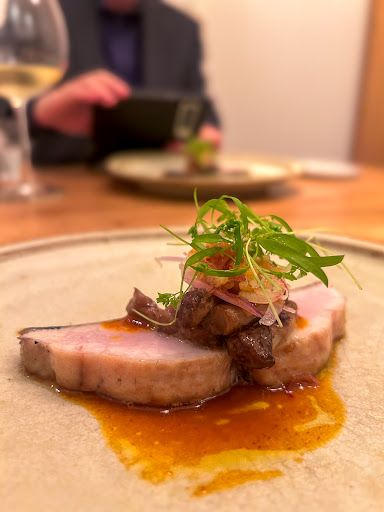 【Tapas】 ・戻り鰹 和歌山県産の炭焼き戻り鰹 下には糖度の高い安納黄金芋、これがデザートかってくらい濃厚且つ甘い 刻んだオリーブが鰹のスモーキーさを引き立ててくれてるね 上にはほうれん草の葉っぱがのっていて彩りも良かった◎