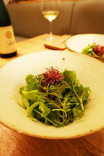 【Ensalada Ajo Blanc】 ・八百富農園 有機野菜 天然舞茸 私初めてサラダで感動しました 知多の有機野菜を使用していて ハーブの下20種類もの有機野菜が! 火入れに拘ってる伊藤シェフ 有機野菜の調理方法はフリット煮たり焼いたりダッチオーブンで焼いたり サクサク食感ももっちり食感もあって飽きない! 有機野菜がとにかく甘くて、自然の甘味が感じられて美味しかった~ アホ・ブランコと呼ばれるにんにくとアーモンドの温かいドレッシングを上からかけてくださるんですが、温かいから香りが引き立ってより食欲そそられました!