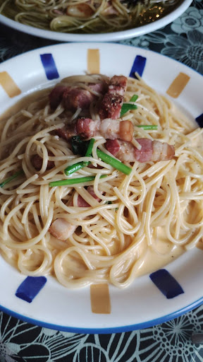 💮カルボナーラ炭焼風1380円 コーンスープのような甘味とコクがあってさらっとしたスープ