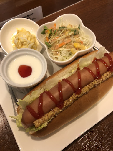 Read more連れとモーニング。 初めて来店しました。 駐車場は店の前に4台ほど停めれます。(他に駐車場有るかは分かりません😅) モーニングメニュー種類が充実してて迷います😊 どれも美味しそうで♬ 朝セット650の中からホットドックのデッカイ版! ウィンナー17㎝って言う長さに惹かれて注文。 連れも朝セット650からハム&チーズとろ〜り目玉焼きを。 ドリンクも7種類から選べれるのも良いね😊 ドリンクは2人ともアイスコーヒー。 はい!ホットドックデカかったよ! ...