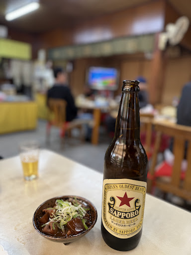 いざ入店! 混んでる感じだったけど、すんなり入れました。 さっそくキリン瓶ビールを注文。 それと串カツ2本、鶏串カツ2本。 追加てどて煮、焼きそば、おでん。 串カツは肉肉しく美味しい。 鶏串カツはもも肉がふわふわで美味しい。 おでんは優しい白醤油仕立てで、今度はタッパを持ってきて買いたいな。 どて煮は甘めでビールもご飯も進むタイプで好みでした。 焼きそばは薄目の味付けでしたので、お好みでテーブルにあるソースをかけても良いのでは。