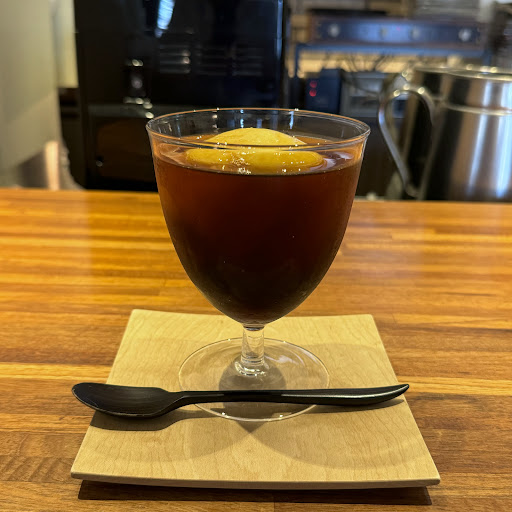 カフェ・バレンシアはエチオピア・ナチュラルの水出しコーヒーに自家製のオレンジシャーベットと薄く切ったオレンジを浮かべたドリンクということ、まずはシャーベットか溶ける前に水出しアイスコーヒーをいただきましたがしっかりしたコクが感じられる美味しい珈琲です。それにオレンジシャーベットも結構しっかりした大きさ、シャーベットそれ自体もしっかりとした酸味が感じられる味わいで美味しいですが、珈琲と溶け合うことで酸味が少し柔らかくなってすごく爽やかな味わいになりますね、美味しくいただけました。