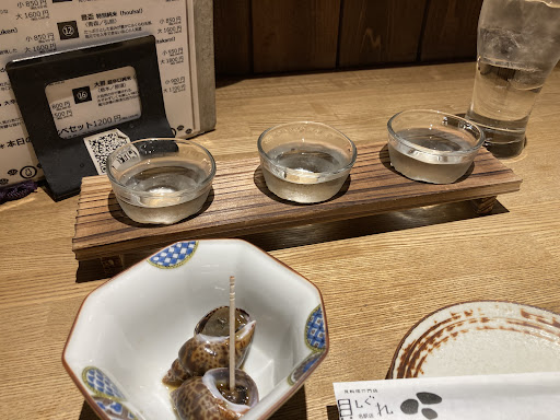 その他気になった点 ・価格帯の割に店員さんが全体的にやる気なさそう。ドリンク作るところに常に人が溜まって暇そうな人が見えます。奥の方の席を様子見に行ったりとかすればいいのにな… 最初に一緒に頼んだお冷は耳に入ってなかったのか持ってきてくれませんでした。日本酒飲み比べセット、銘柄は一応最初に言ってくれるのですが、早口に一回しか言われないので、丸暗記で言ってるんだろうな…と感じました。聞き返すのも、どれがどんな味とか聞くのも憚られる雰囲気だったので、名前もよく分からず飲みました。 ・キッチンのアクセサリーバチバチのメガネイケメンお兄さんがマスクをしていない。その上、客に出すやつでは無いと思いますが、手で掴んで何か食べてる。私も居酒屋経験者ですし、飲食店のキッチンではそういうこともあるかとは思うのですが、カウンター席から丸見えのキッチンでやるのはどうかと…マスク無しで店員さん同士が喋ってるのも気になります。 ・お通し 最初にメニューの説明をして頂いたところにはお通しで〆の味噌汁がくるという記載がありました。が、ファーストドリンクと一緒に来たのはカウンターに並んでいたおばんざいの一つのバイ貝のうま煮。それならそれでいいのですが、記載が違うのであれば直すべきかと…。