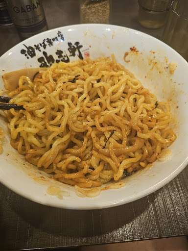 Really good but not great if you don't speak Japanese. The menu is entirely in Japanese, and Abura Soba is a dish that you need to eat a certain way to truly enjoy. There is a picture on the wall that tells you how, but incase you need information, here it is. Basically, order your Abura Soba [油そば] from the vending machine style thing by the front. Hand your tickets to the person behind the counter, if you want, you can ask for hard or soft noodles. Once you get your noodles, there are two bottles of oil on the table or counter. Squeeze each on your noodles for two rotations around the bowl, that'll probably be enough. Add whatever condiments on the table you want: pepper, red pepper, garlic, etc Mix it...
