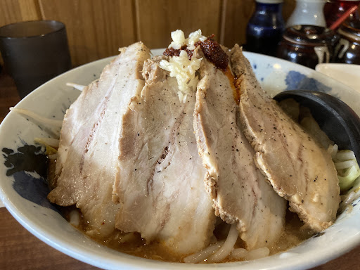 土曜のお昼は「孤独のグルメ」。誰にも気兼ねなく、食後も独り。何が言いたいかというと、ニンニクチャンスの到来です。ちょっと歩いて、名古屋・金山総合駅近くの「カナヤマ55」です。つけ麺と迷って、「二郎系ラーメン」にしました。大須商店街や、名古屋駅のお店にはよく行きますが、意外に金山は初めてです。最近、タッチパネル式の券売機が増えましたね。写真付きは嬉しいのですが、チャート式なので、自分が選んだ方向性以外の、メニューの全体像がよく分かりません。 平日は行列なのですが、土曜はカウンターに空席がありました。途中の大津通りの有名ハンバーガー店はとんでもない大行列でしたので、客層と混雑具合が、平日と土日で異なるのが良く分かります。着席して食券を渡すと、ニンニクの有無を聞かれ、「あり」でお願いしました。その他のトッピングは無く、野菜増しは有料でした。 ほどなくして着丼。提供時間は早めです。バラチャーシューは巻いていないタイプ。ヤサイの山のてっぺんにニンニクと辛味噌が鎮座するのがデフォルトなんですね。二郎系というより、「角ふじ」っぽいビジュアルです。麺は、加水率高めでツルっとした中太麺。歯切れやのどごしが良いもので、スープはあまり吸いません。つけ麺でよくあるタイプで、オーション香は感じません。本家のワシワシ系と対極ですね。 スープは魚介の香りがします。つけ麺のタレをスープ割りしたような印象で、サラリとしてうま味があり、アブラ濃度や乳化度は低く、罪悪感は控えめです。ニンニクは刻んであるもので、かなり大粒でした。奥歯で噛み当てると、辛味を感じるくらいフレッシュで、麺、スープ、ニンニクとの総合バランスは高いなという感想です。 野菜はもやしのほかにネギが入るのが特徴的。チャーシューは脂が抜けてさっぱりしたもので、とっても食べやすいです。また、「55系」の特徴として、1人1個の生卵がサービスされる為、途中で投入して「すき焼き」っぽく味変して食べるのも楽しいです。 土日もランチは大盛りとライスが無料でした。比較的少なめなので、二郎系に食べ慣れている人は、大盛りにし...