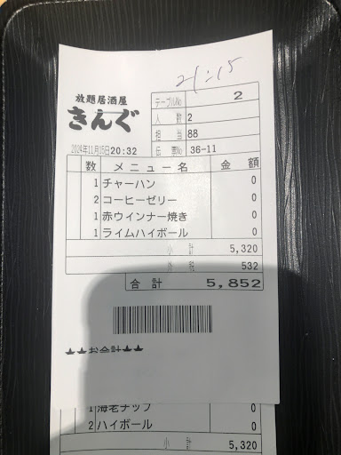 ถ้าดื่มด้วย + อีก 330+ เยน รวม Vat10% เป็น 2,563 เยน (589.5) เรทกินดื่มไม่อั้นขนาดนี้ราคาพอๆกะในไทย (และถูกกว่าหลายร้าน)