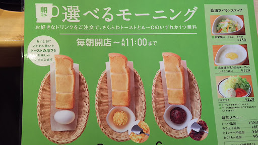 モーニングメニューは3種類選べ、ゆで卵・手作り卵ペースト(つぶし卵)・小倉と選べます。 コールスローやサラダやヨーグルトなどの追加メニューもあります。
