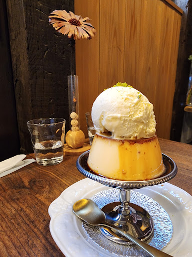 そのプリン、プリンの上には同じくらいの大きさのバニラアイスがバランス良く乗っています、ビジュアル的には見事ですが食べるのはなかなか難易度高いですね笑。味の方は昔ながらの固めのカスタードプリン、甘さも抑えめでカスタードのまろやかな味わいが楽しめるワタクシ好みの美味しいプリンでした。