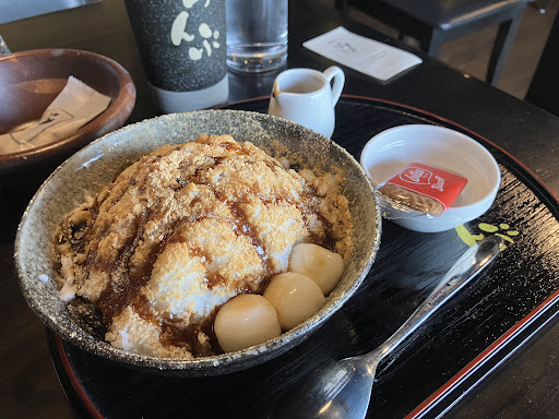 【名物ふわ氷】 珈琲屋らんぷオリジナルのかき氷。ふわふわな食感を謳うだけあって、食べた食感も軽いかき氷でした。きな粉、抹茶、ココアの三種類で数量限定。12時以降から注文できます。 今回はきな粉を注文しました。黒蜜も自分のお好みの量で調整できます。