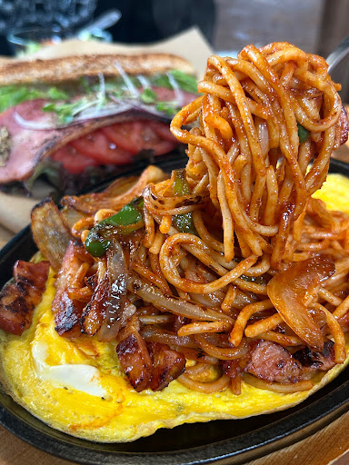 熱々の鉄板に敷かれたふんわり卵の上にたっぷりのケチャップソースで炒めた スパゲティを盛り付けました 甘めのケチャップに絡むもちもちの麺がクセになる味わい