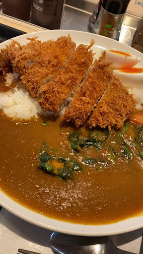 ‘23/5月 とんかつの松のやさんでカレーライス専門のオーダー🍛✨ ◆彩り野菜のロースカツカレー大盛り¥1,070 松のやさんのサクサクコロモのロースカツがのったカレーライス🍛✨タマネギ🧅ニンジン🥕ほうれん草🥬ジャガイモ🥔トマト🍅のお野菜とゆで卵🥚 辛さは中辛(1辛🌶️)で、ひと口いただくと風味はスパイシーで味は甘みのあるマイルド😊つづけてモリモリ食べていると後からスパイスが効いてきてカラダHOT😆💦 風の冷たい日でしたがカラダポカポカになりました😚