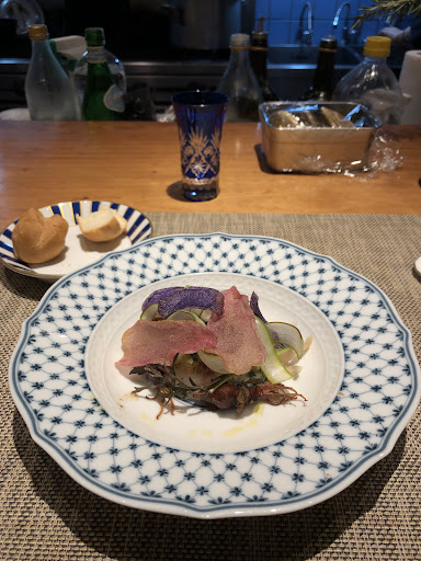 「前菜①」 キンサイと呼ばれるセロリの仲間であるほろ苦い野菜に香草焼きしたししゃも、A5ランクの飛騨牛、ローストした鹿肉、バルサミコ酢煮込みした甘鯛、とひと皿でかなり贅沢なサラダ アンチョビドレッシングが良いアクセント 肌寒い日でしたので温かい前菜は嬉しかった◎ ししゃもの芳ばしい香りに食欲そそられ、一品目として相応しかった◎