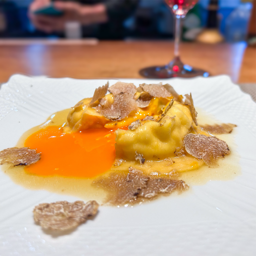◎名古屋コーチン卵黄入り手打ちラビオリ 白トリュフ掛け
