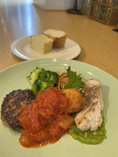 (前回投稿文) 問題なく美味しかったし、3種類のメインがのったランチを注文しました。サラダバーが付いていて、フレッシュな野菜をたくさんいただく事ができます。ドレッシングは3種類でシーザー、和風の2つは一般的なものでしたが、トマトのドレッシングは大変おいしかったです。スープのミネストローネは具沢山でしたが、塩味が強く、5口くらいでギブアップしました。メインのハンバーグと魚のムニエルは普通の味でしたが、コロッケは冷凍食品のような味でちょっと残念でした。ドリンクバーも付いていましたが、甘いジュース類は飲まないので、選択肢が烏龍茶しか無く、残念でした。コーヒーはコストがかかるのかもしれませんが、せめてホットコーヒーかホットティーでもあれば、ホッとするのになあと思いました。セットにはパンが付いていましたが、サラダバーには白ごはんもあったので、パンだけでは足りない人には良いのかなあと思いました。個人的には、フレッシュなレタスやきゅうりやトマトなどをたくさん食べ...
