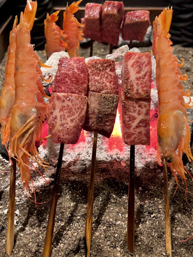 囲炉裏の火によって調理された鮎、里芋、海老、麹鮭、黒毛和牛などは炭の遠赤外線の効果もあってふっくらとしており、みずみずしい。永遠に食べ続けられるのではないかと錯覚すらしてしまう。