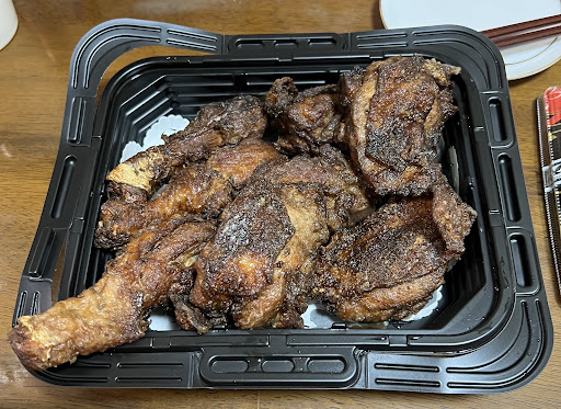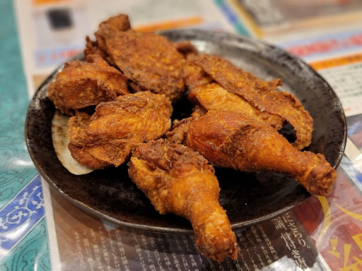 When you take a bite, you hear a crunchy sound and the meat juices overflow. Deep-fried chicken, well seasoned, delicious.