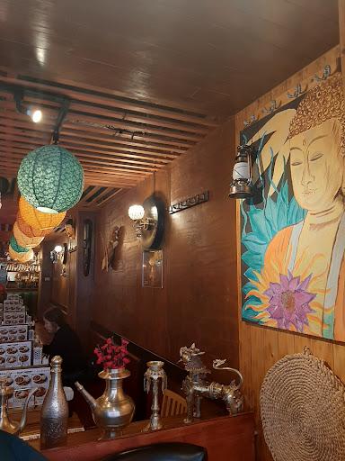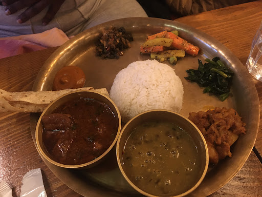 ランチの説明書きによると ネパールのタカリ族がお祭りやお祝い日で食する料理 ネパールそばがき風、ご飯、チキン or マトンカレー 豆スープ、大根の漬物、トマトの漬物、乾燥発酵野菜の漬物 サラダ、野菜カレー、青菜炒め、バターオイル、パパドゥ、デザート