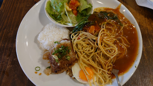 平日昼に訪問。席は8割埋まってましたが、ほぼ待たずに座れました。 ワンプレート大盛(普通はパスタ200g)、おろしハンバーグを注文。ニンニクを炙る香りを嗅ぎながら程よく待つ。 パスタはベーコンほうれん草のペペロンチーノにあんかけ。ペペロンチーノ自体がしっかり作られているのであんかけは無くても良さそうですが、あればそれはそれで良し。味が壊れたりはしません。塩味が過剰な印象もなし。ハンバーグは柔らかく、外は揚げ気味になっていますが、おろしが滲みて、クリスピーさはなし。目玉焼きはリングで焼いているようで、縁がカリッとしてます。サラダは、ドレッシングは少しですが、水臭くはなく、スパゲッティの味を邪魔することもなくちょうどよい。断面の変色もなく、品質への気配りも感じます。 ボリュームはピッタリ(成人男子)で、腹ペコをしっかり満たしつつ、食べすぎた罪悪感もなし。 これで1210円。肉あり野菜ありで、ランチとして十二分に欲求を満たしてくれました。贅沢を言えば、食後にコーヒーがあると最高ですが、バッチリ再訪候補になりました。 写真は少し食...