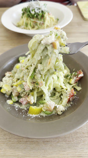 頂いたクリームソース系のパスタは 重たくないあっさりなクリームと チーズの香りがとっても合う お野菜たっぷりでカラフル 目から楽しめた🎵