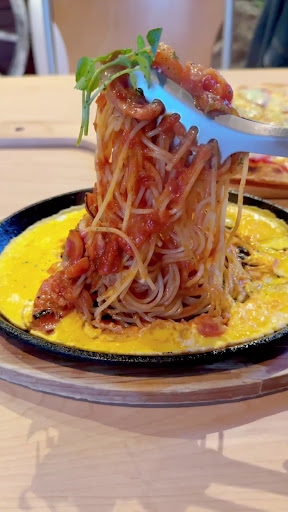 鉄板パスタは細麺で、 このビジュアルからもうやばめ。 美味しいので毎回頼んでます🙏🏻✨