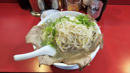 鳴るお腹を抑えながらお店に入ったけどね 入って、いきなりビックリ‼️ 定員の怒号ととも似て「いらっしゃい‼️」の景気な声‼️ ボクわ心臓が止まるかと思うくらいでした 恐る恐る券売機で券を買って 席に着くと、すかさず定員が 「野菜や麺の硬さは普通でいいですか?」 目を丸くするボクわ、軽く頷くと 暫くしてボクの目の前に出されたんですよ