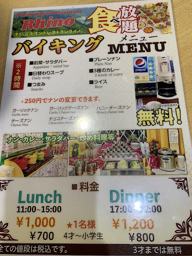 2023.10更新します サラダバー、ドリンク付で食べ放題で大満足です。味も日本人向けでマイルドでした。 希望を伝えると対応してくれるみたいです 営業時間は ランチ 11:00〜14:30 1100円 ディナー 17:00〜22:00 1300円