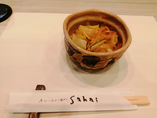 A hidden gem! We could have walked right past it & not realized what was waiting for us behind that sliding door: some of the most tender & flavourful steak I’ve ever had! (I used to work at a steakhouse, so I’m pretty particular about my steak! lol) If you’re a fan of melt in your mouth steak, then wagyu beef is worth every penny… err, I mean ¥! I would highly recommend sakai & their service was...