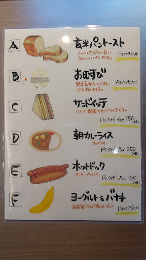 モーニングはドリンク代のみで玄米パントースト、おむすび、ヨーグルト&バナナの3種類に追加料金でサンドイッチ、朝カレーライス、ホットドッグにすることもできます。朝カレーと迷いましたがこの日はサービスモーニングのおむすびをチョイスです。