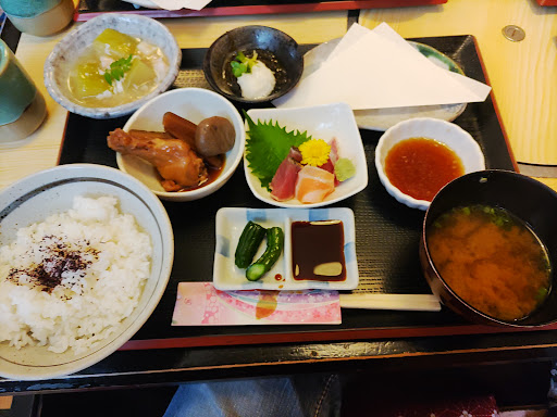 ランチを注文。値上がりしましたと壁に張り紙がありました。 もずく酢、麻婆豆腐、マグロやサーモン含む少なめの刺身、だし巻きの明太マヨのせ、赤味噌のなめこ汁、かき揚げ1つ、白米、食後にはバナナとリンゴが付いてきました。 刺身とかき揚げが特に美味しかったです!