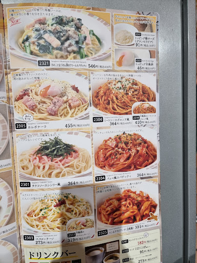 Read moreHighly recommend this fast-casual Italian-esque restaurant to tourists for a quick and affordable bite to eat! The menu has English and uses a coding system, with each food corresponding to an alpha-numerical code that you write on an order slip, then press a button to call the waitstaff for pick-up. It was about 1950 yen (~$14 USD at time of writing) for our meal: Two plates of pasta, one "free-flow"/free refill drink, one 250mL carafe of wine, and a chocolate truffle ice cream. I especially recommend the chicken carbonara pasta dish and ice cream, they were...