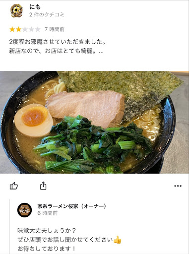 定められた料金を払い、食券をお渡しし、ただ黙って食事をしただけですが、ラーメンにも桜家様のお店にも不満はありません。出していただいたラーメンが、私の舌には合わなかだけですので。