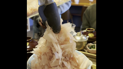 削りたてのかつおぶし全部に 醤油を注ぐと固まって 食べづらくなってしまう事、 出汁をひつまぶしのようにかけて 味の変化も楽しめる事を 説明してくれました。